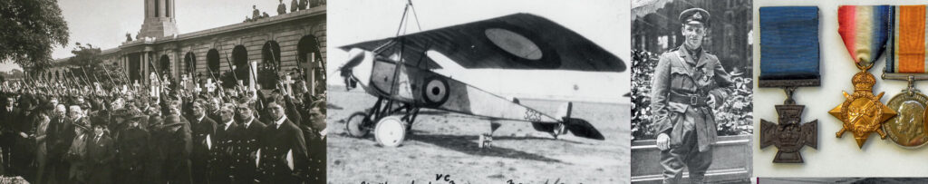 “For most conspicuous bravery on the 7th June, 1915, when he attacked and, single-handed, completely destroyed a Zeppelin in mid-air. This brilliant achievement was accomplished after chasing the Zeppelin from the coast of Flanders to Ghent, where he succeeded in dropping his bombs on to it from a height of only one or two hundred feet. One of these bombs caused a terrific explosion which set the Zeppelin on fire from end to end, but at the same time overturned his Aeroplane and stopped the engine. In spite of this he succeeded in landing safely in hostile country, and after 15 minutes started his engine and returned to his base without damage.”